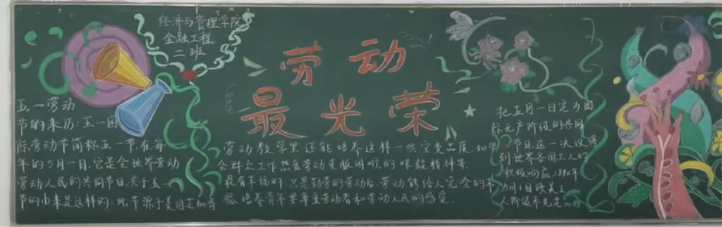 经济与管理学院于4月20日至5月15日开展劳动实践月活动,为切实引导学生积极参与,掀起“劳动最光荣,劳动最崇高,劳动最伟大,劳动最美丽”的热潮,学院组织各班级开展“劳动最光荣”主题板报评比活动。