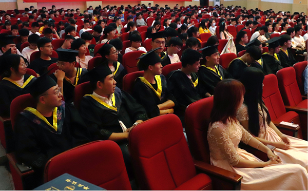 本科毕业生代表李兆宁和研究生毕业生代表张露露先后发言,他们纷纷回顾了在学校的学习、生活和成长历程,表达了对学校和师长深深的感谢和崇高的敬意。李兆宁结合自己参加比赛、学习经历,讲述了大学生涯的收获,呼吁学弟学妹要端正态度、积极参与各类学生活动,全面发展自己,不要辜负美好的大学生涯。