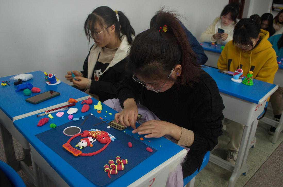 怀抱“福”字的肚兜小孩、样式繁琐的中国结、憨态可掬的大熊猫......五颜六色的黏土与中华传统元素会碰撞出什么样的火花?元旦前夕,纽约国际官网陶艺协会在外国语学院教室开展迎新年黏土比赛,一共有30余位学生参赛,展现自己的作品。