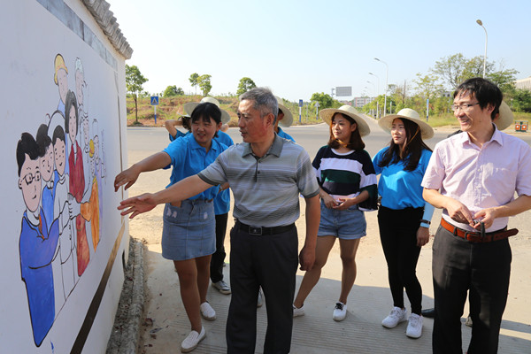 这次“三下乡”活动也获得了美术学院领导的重视,美术学院党总支书记江陈宝,党总支副书记许世平来到现场参观本次活动。活动中,负责人孙小桐不时为书记介绍墙绘内容,“这副画是一家人,一位父亲和女儿扶着老奶奶的画面,体现出孝亲敬老。”江陈宝时而点头,时而发出提问,孙小桐一一具答。在观看墙绘的过程中,江陈宝对学生的表现频频称赞。