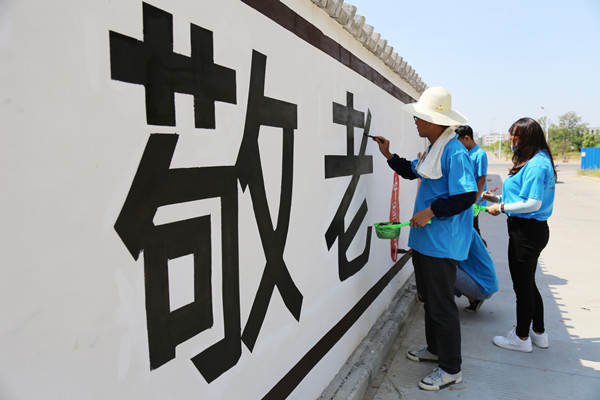据了解,这次活动的主题是“青春建功十三五,携手共筑中国梦”,活动分为两站,分别为十里乡的凤凰村与茅岭。学生们围绕主题,自己设计字画并进行创作。“我们先给每块地方设定一个主题,再根据主题设计墙绘内容,设计好内容后我们会先在网上搜索相关图片,再结合自己的想法进行绘画。”美术学院学生李政华说,在墙绘过程中,他顶着烈日,拿着装着颜料的瓢,一笔一画地描绘着,不小心沾在身上的颜料直到结束后才发觉,“只要投入进去就感觉不到累,而且这过程很享受,心里只想着把它画好。”