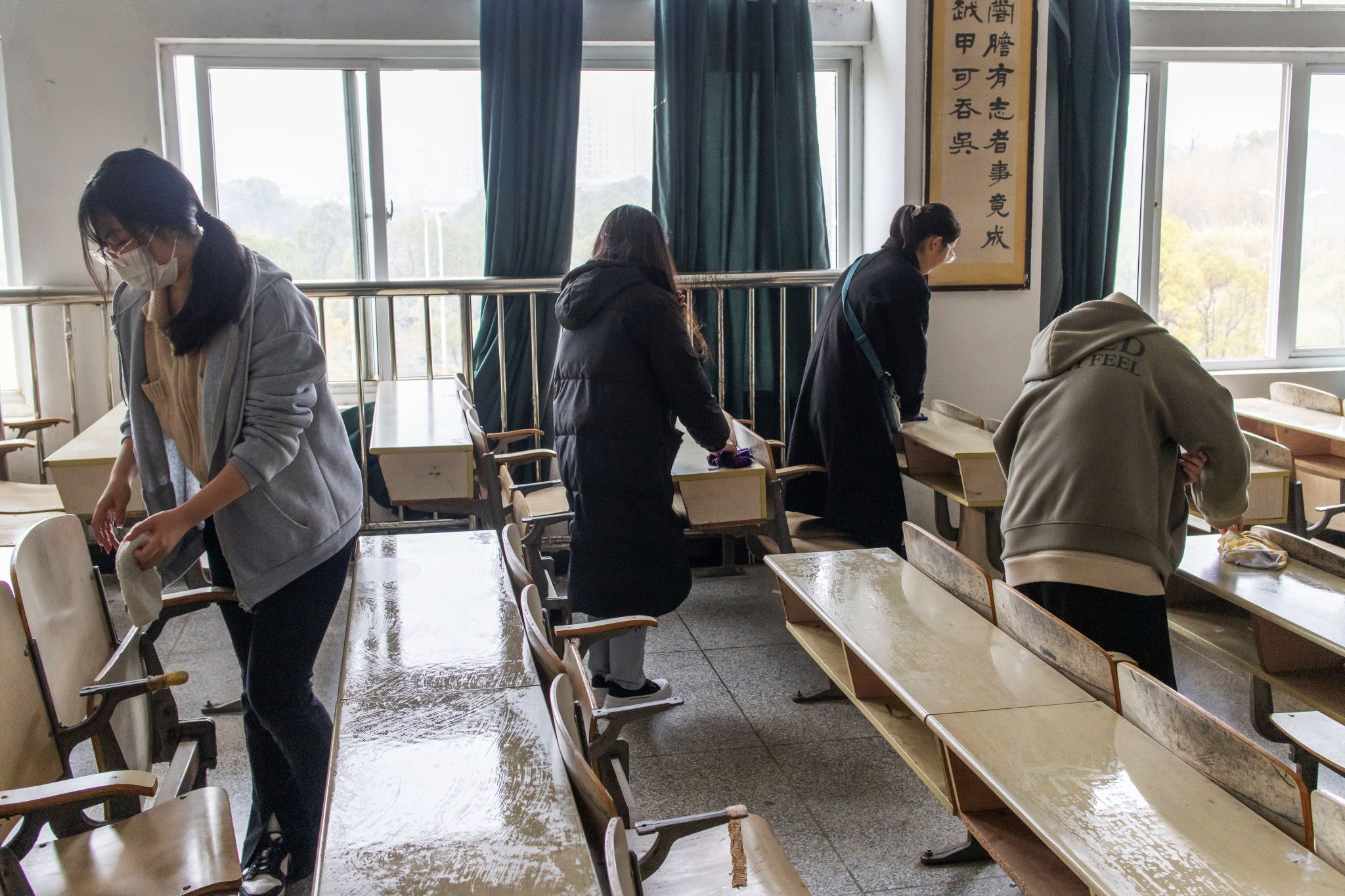 文渊楼一楼的8个教室是第一小组的责任区,小组组长、思想政治教育专业2021级(2)班的刘东来带领着11名组员清理垃圾、擦洗桌凳、清洁消毒,按部就班地完成每一间教室的清扫任务。刘东来表示,每天都会有大量学生在四栋主教学楼上课,打扫教室虽然是一件小事,却可以让同学们拥有一个干净整洁的学习环境,从而更好地投身学习。“尽己所能帮助他人会让我觉得开心与满足,希望在服务中实现自我价值,在实践中学本领、长才干。”