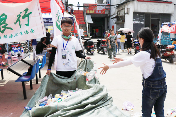 “绿色银行就是把我们平时随处可见的塑料瓶、废纸壳等收集起来,进行回收利用,这样就可以美化校园环境、节约资源,同时通过活动吸引在校大学生关注环境问题,增强环保意识”赵善慧说。(文/学生记者 汪习习 图/学生记者 张正)