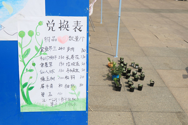 活动持续到中午时,西苑食堂已经摆满了三大袋装满了塑料瓶,以及不计其数的废旧纸张和书本。“因为今天前来兑换的人太多了,准备的绿植不够,所以临时又去采购新添了一些花草。”活动负责人赵善慧说。