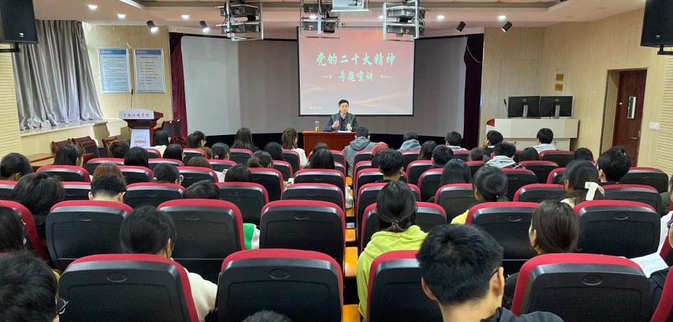 11月16日,资源环境学院党委书记夏宏宇在F411报告厅宣讲党的二十大精神,学院第66期入党积极分子80余人聆听宣讲报告。