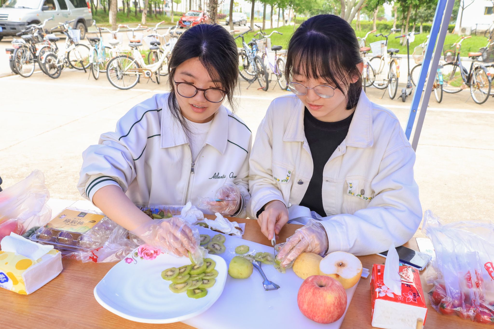 面包和圣女果拼合而成的“女驸马”、用香橙雕刻成的小篮子……精致的摆盘让中国语言文学类专业2022(2)班的陈欣雨“叹为观止”。“这个水果拼盘构思真巧妙,女驸马是黄梅戏的经典片段,作品完美地融合了安庆当地的特色文化,让我印象很深刻”。
