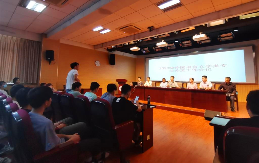为深化教学改革,满足学生多元化发展需求,6月2日,外国语学院召开外国语言文学类专业学生分流会议。外国语学院院长王先荣、副院长江加宏、党委副书记夏斐、各专业负责人、辅导员及2020级外国语言文学类专业全体学生参加了此次分流工作会议。