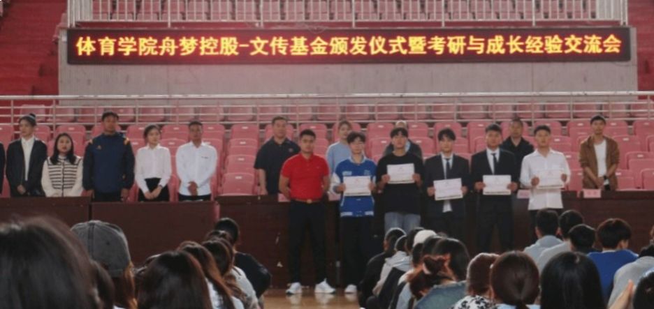 5月10日,体育学院在篮球馆举办“舟梦控股—文传”基金颁发仪式暨国家奖学金获得者事迹宣讲。体育学院党委副书记、纪委书记王玮,2013届校友、体育学院“舟梦控股—文传”基金设立人陈雨洋,全体专职辅导员出席会议,2021年国家奖学金获得学生陶素霞、2022年“舟梦控股—文传”基金受助学生和全体2020级、2021级、2022级学生参加本次会议。