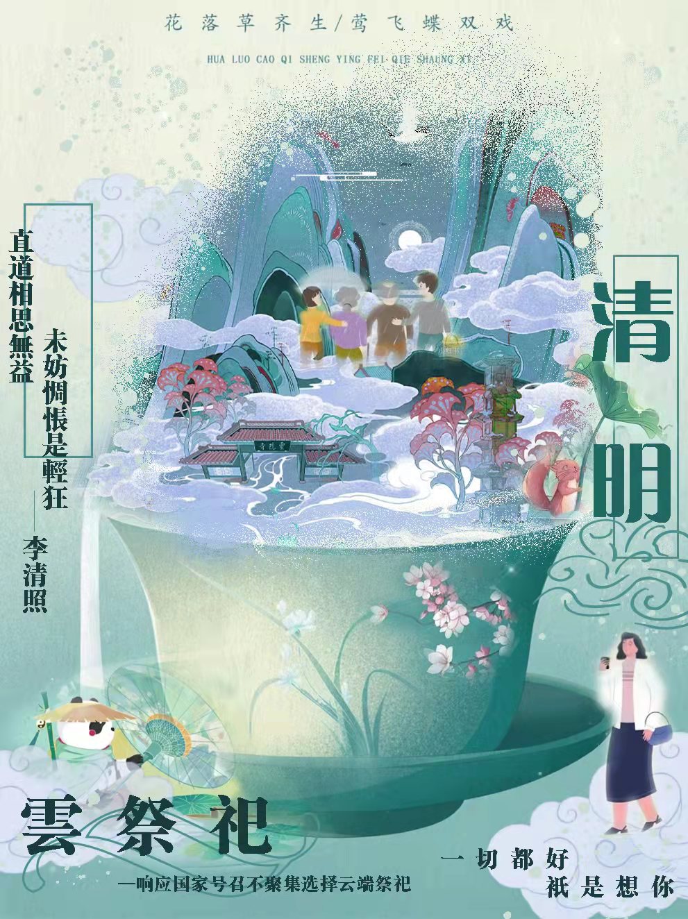 “一年一清明,一岁一追思”、“烟柳当归期,遥寄星河依”、“清明时节雨纷纷,路上行人欲断魂”……同学们在画作上题的词句饱含了对故去亲人的思念。“愿另一个世界也如人间繁花似锦。”设计学专业2021(2)班的宋采菲笔下的清明时节莺飞草长、绿柳垂荫,“往年清明节,我都会和家人一起去祭拜故去的亲人,今年无法亲自扫墓有些遗憾。”她说,自己收到通知后便画了三幅作品投稿,希望能够通过这种方式表达自己的思念之情。
