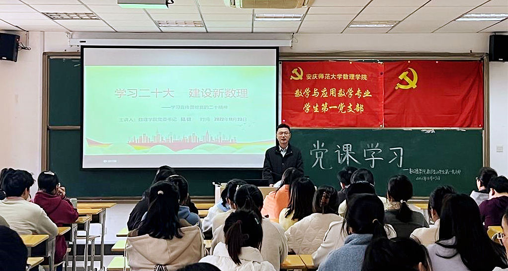 11月23日,数理学院党委书记陆健以“学习二十大,建设新数理”为题,在204教室给高等数学教师党支部、数学与应用数学专业学生第一党支部、统计与信计专业学生党支部全体师生上了一堂精彩的党课。