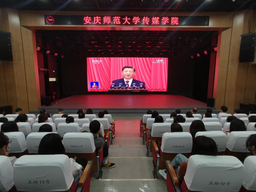 10月16日上午,传媒学院组织学院师生集中观看中国共产党第二十次全国代表大会开幕会。学院党政班子成员、科级干部、党支部书记、所有管理人员、全体学生党员以及学校第66期入党积极分子培训班的全体学员200余人在学院演播厅进行观看;学院团委、全体学生会成员在k505教室进行观看;各级各专业学生由各班组织在教室观看。
