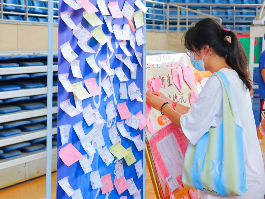 思想政治教育专业2022(1)班的李星语一来到报到处,便收到了来自志愿者们的热情接待,左手拿着爱心信,右手提着中秋月饼“大礼包”,她的脸上不禁笑开了“花”。“从报到入学事项到校园生活建议,一位学长在信中向我传授了新生独家‘宝典’,这让我更期待接下来的大学生活了!”收获满满之余,他还在迎新处的心愿墙上贴上了自己的愿望便利贴。“‘以梦为马,不负韶华’,希望能够在不久的将来遇见更好的自己!”