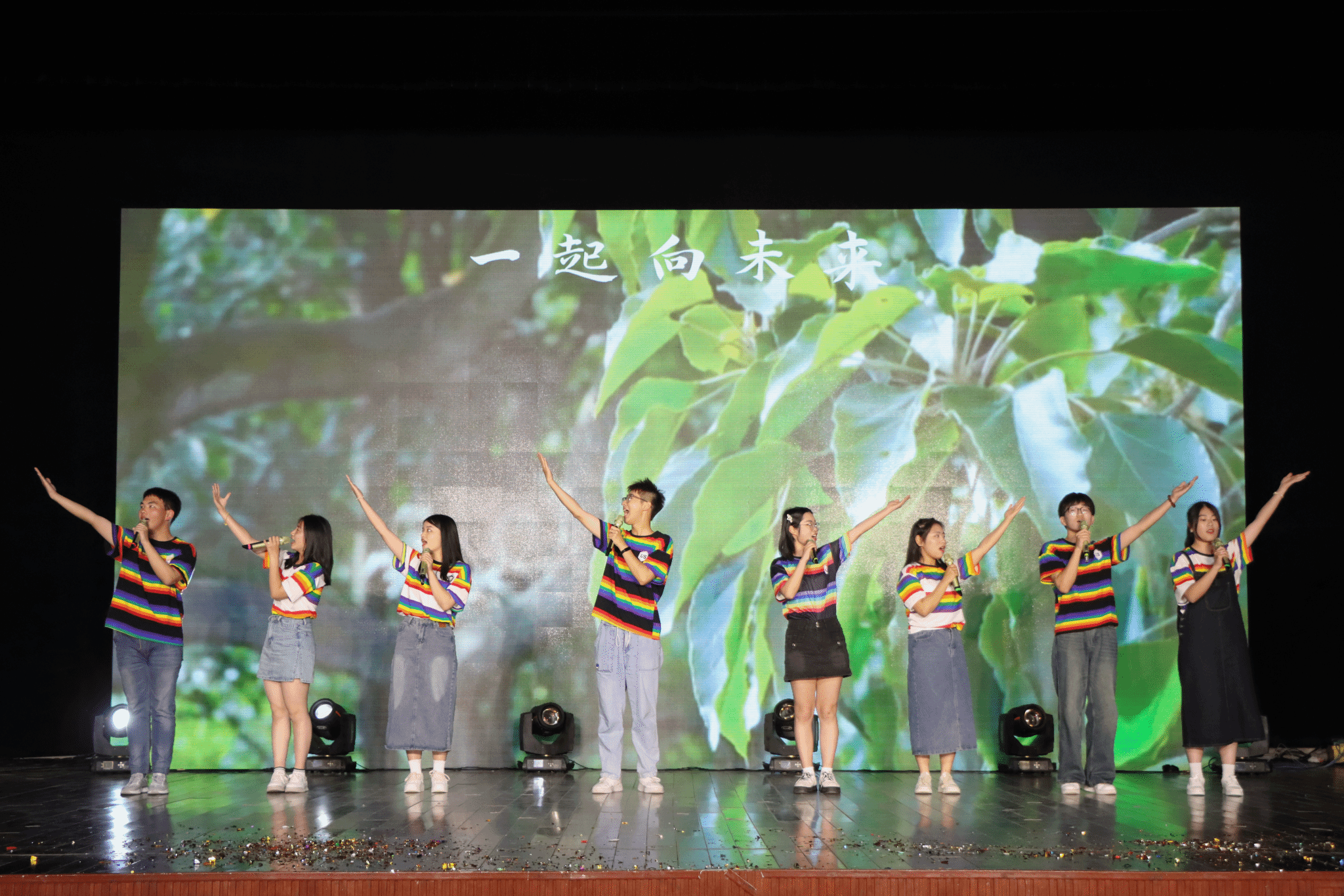水袖飘扬,扇面轻合,歌曲《赤伶》结合经典戏腔元素,让学生在聆听中燃起爱国热情;古朴校史墙,静谧图书馆,中场游戏“印象大学”以图片为媒,为毕业生保留着师大“独家记忆”;彩虹服装,统一手势,合唱《一起向未来》极具学院特色,采用9种语言与师生共盼未来。