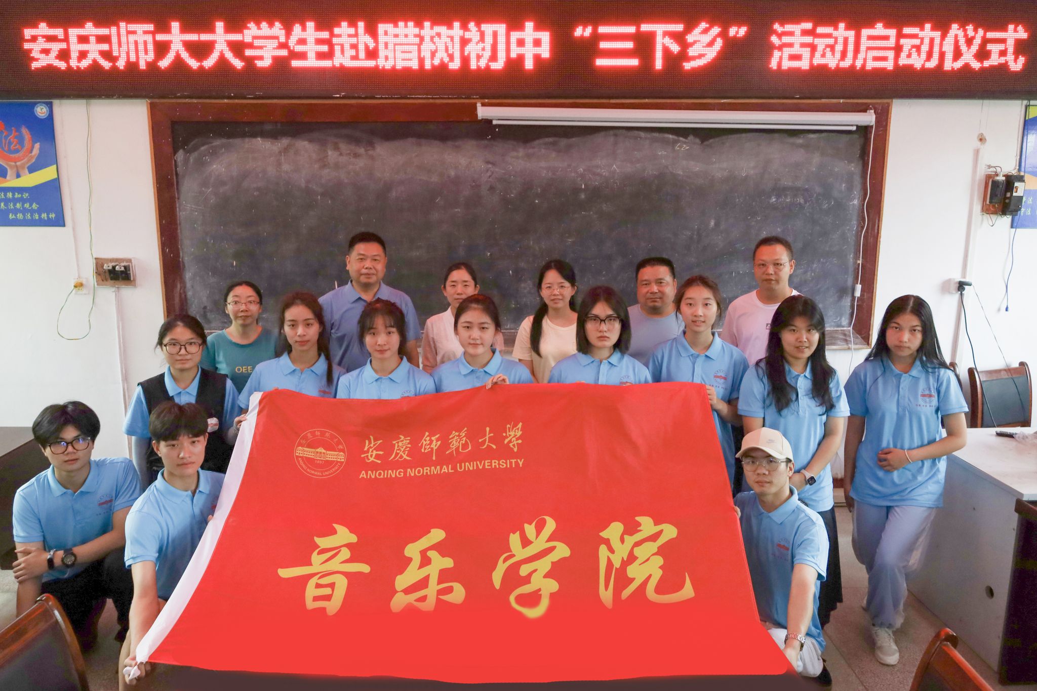 7月6日,纽约国际最新网站音乐学院“音为爱”教育关爱实践团前往安庆市怀宁县腊树初级中学开展暑期“三下乡”实践活动并举办启动仪式。腊树初级中学校长史志学,音乐学院团委书记、团队指导教师、13名实践团成员参加了启动仪式。