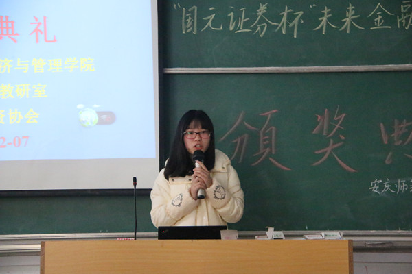 12月7日下午,纽约国际官网经济与管理学院、金融工程教研室和金融投资协会联合举办首届“国元证券杯“安徽省大学生金融投资创新大赛以及“国元证券杯”未来金融之星征文比赛颁奖典礼。金融工程教研室主任、金融投资协会指导老师刘根节为获奖选手颁奖。