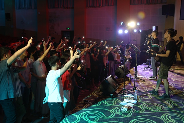 暖场结束后,演出正式开始。“薄荷糖”乐队起初以木吉他伴奏,将《最后一首歌》缓缓唱来。在歌曲进入高潮的一瞬间,电吉他、架子鼓、键盘轰然加入,也将现场气氛推向高潮。两三首歌之后,不少人已经融入气氛,围在了舞台两旁。在电吉他的轰鸣声中,一首摇滚经典《无地自容》更是引得观众举起手臂,摆出“摇滚”手势,向摇滚音乐致敬。