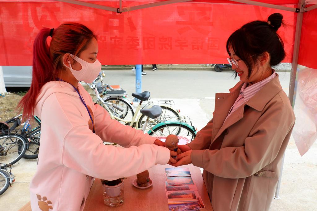 “爱心义卖活动,走过路过不要错过!”活动刚开始,便陆陆续续有学生被叫喊声所吸引,现场逐渐热闹。外国语言文学类专业2021级(12)班的学生陆梦瑶是活动摊位的第一位光顾者,远远地就被摆放的绿植盆栽吸引的她,“二话不说”就花费2元钱购买了一盆多肉。“这是我第一次参加志愿公益活动,能帮助到需要的人们我也非常开心,如果之后有机会,我还会继续参加这类活动。”