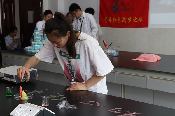 实验开始前,“趣味化学科普浩然工作室”的成员们便身着白大褂开始调制实验所需的化学试剂。“化学是一门充满魅力但也隐含危险的学科,大家在平时做实验的过程中一定要注意安全。”随着对实验操作注意事项的介绍,化学专业2019(1)班学生李浩然带领大家开启了神奇魔法之旅。