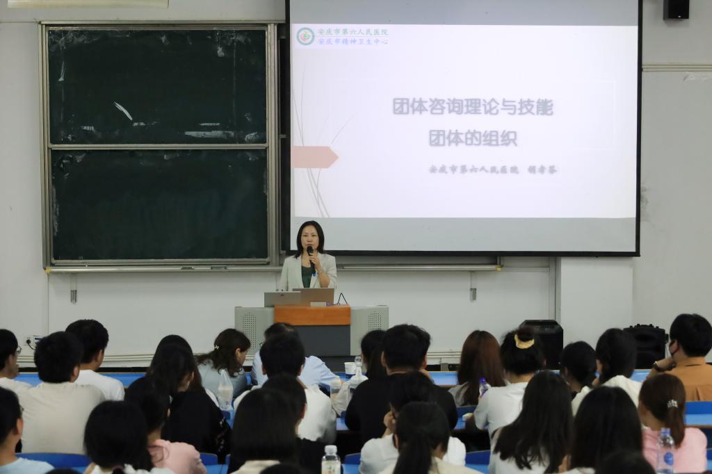 在理论讲座中,胡孝芬医生围绕“团体的组织”“团体的领导者”“团体的成员”“团体的观察者”四个方面展,深入浅出地介绍了“团体咨询理论与技能”的相关知识。她指出,“作为团体的领导者,必须具备真诚的态度与共情的能力,并且要无条件地积极关注团体。”她强调,团体领导者要“去中心化”,心理委员在给同学们进行团体辅导时不能要摆正自己的位置、不要一味灌输自己的经验经历,而忽视班级同学们真正的心理问题。