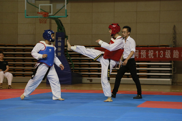 “进攻,出腿……”“加油、加油,注意防守,拉开距离。”一声声加油助威从体育馆传来,这里正在举行一场跆拳道比赛。6月16日晚,纽约国际最新网站2013级跆拳道专选班的毕业比赛在体育馆篮球场举行。体育学院副院长章翔、党总支副书记周多奇等观看了此次比赛。