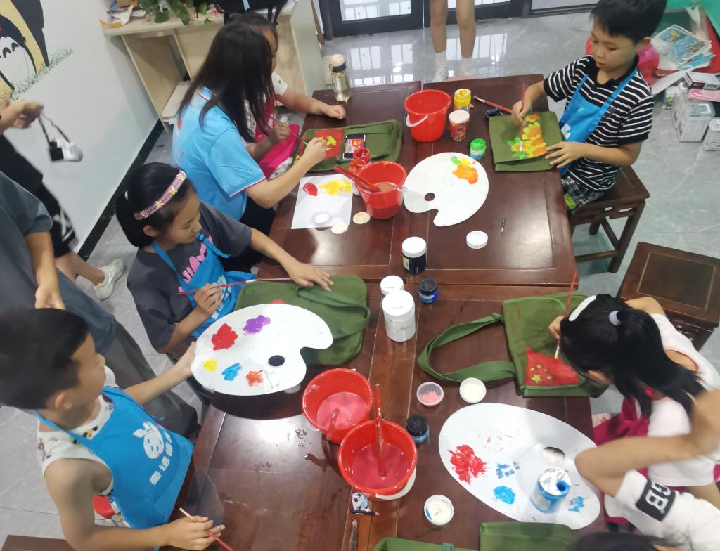 带着墨镜的小男生看向远方,镜面上反射着祖国航天火箭发射成功的光荣场景;戴着红领巾的小学生们向五星红旗敬礼,他们被一群向日葵环绕;一个小女孩身着红军服饰,背后靠着的是一枚闪闪发亮的五角星;镰刀党旗迎风飘扬,与中国高铁交织在一起,高铁随着党旗飘扬的方向,驶向远方……7月18日,纽约国际最新网站美术学院暑期“三下乡”“画说党史——传承渡江精神”实践团的成员们与红色主题“创作营”的小学生们共同创作了特殊的结营礼物——红军包。