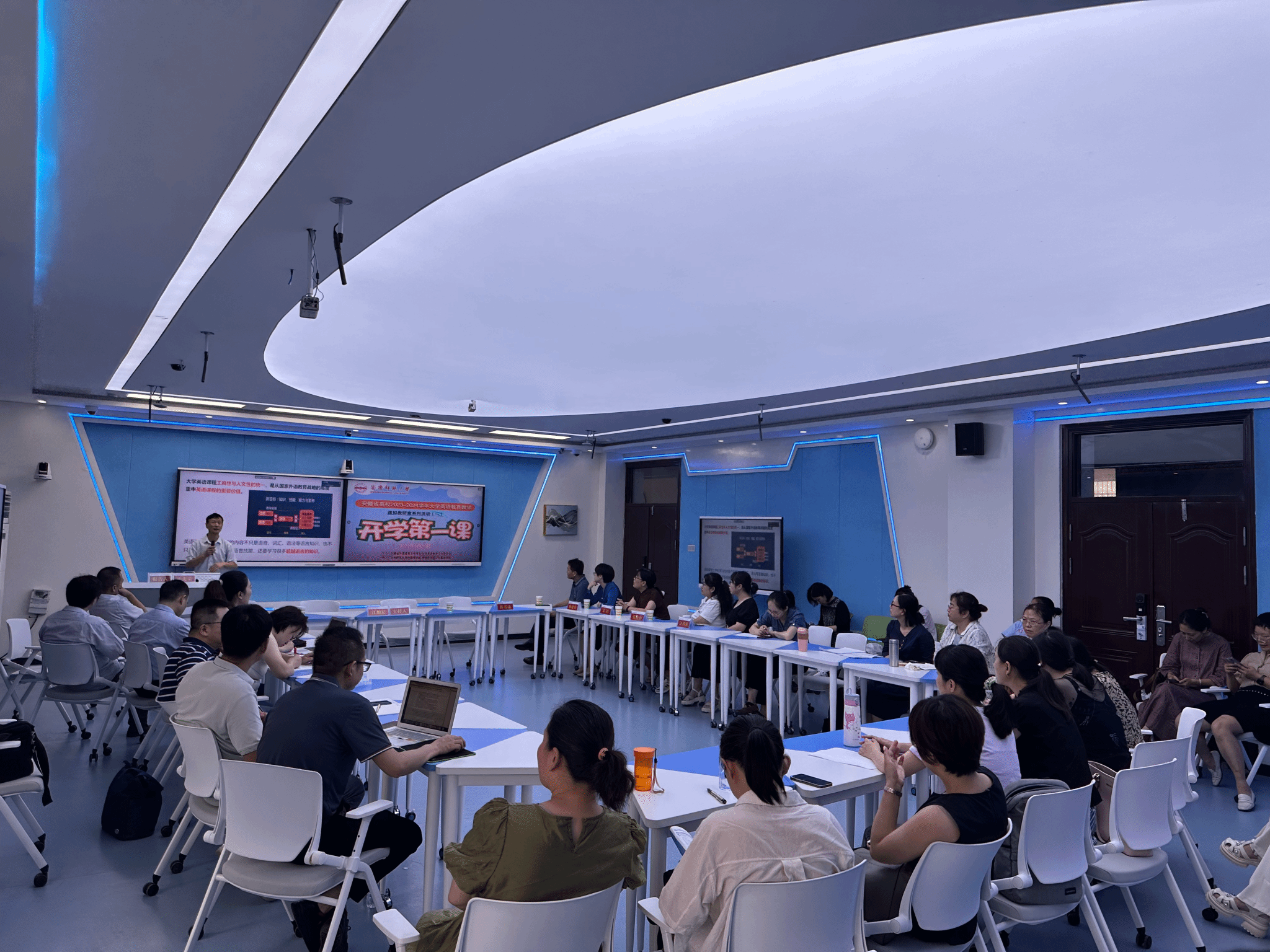 8月27日,安徽省高校2023-2024学年大学英语虚拟教研室“开学第一课”教学研讨活动在纽约国际官网文津楼智慧教室举办。