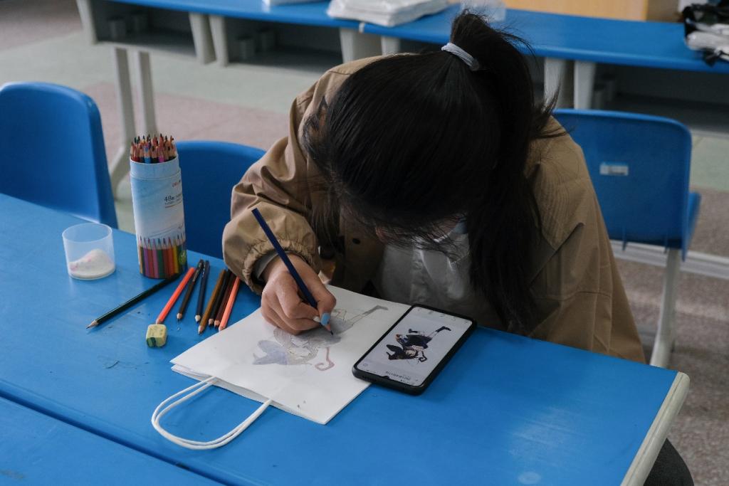 来自英语专业2020(10)班的王惠是协会活动的“常客”,协会的每次活动都会出现她的身影,“平时我们课程安排得很满,学习压力很大,而协会的活动恰好给了我一个放松的机会。”绘画作品已即将完工,只见她用黑铅轻轻略过几笔,给人物加上了眼睛,一个国风美少年的形象顿时展露出来。