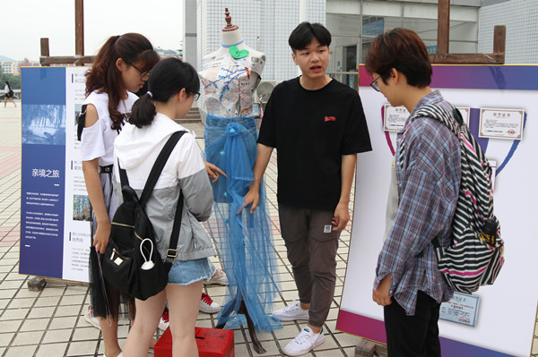 “我们这件衣服主要材料是广告布和塑料袋,衣服上的蝴蝶和花都是手工折成的。”环境科学专业2017(2)班的杨昕玥正在向同学们介绍她的作品。私底下很喜欢汉服文化的杨昕玥还在作品中融入了汉服齐胸的设计理念,让同学们欣赏到现代礼服的同时,也能感叹中国传统服饰的无穷魅力。