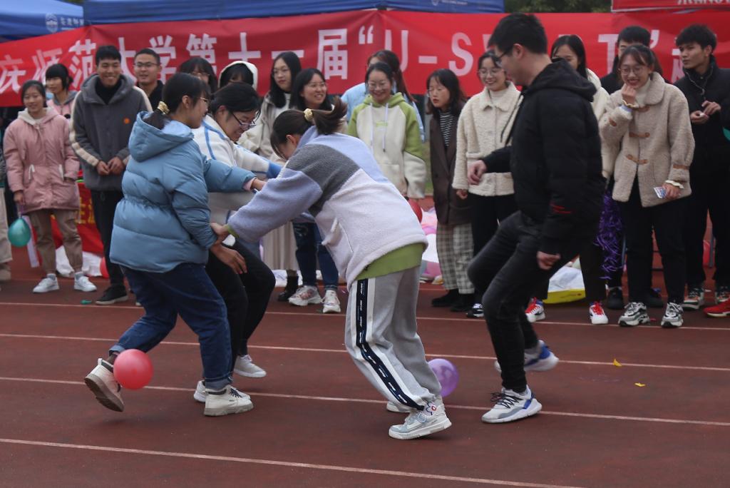 “保护好她的气球!”踩球、闪躲、拉扯,操场上正在上演一场“追逐大戏”。女生绑球、男生保护,在踩气球项目中,有的队员没走几步就被“爆”球淘汰,有的甚至踩掉了对方的鞋子,现场欢声笑语不断。虽然天工不作美,在项目进行到一半下起了雨,但参赛选手“热情不减”,戴起帽子冲向对手的气球。