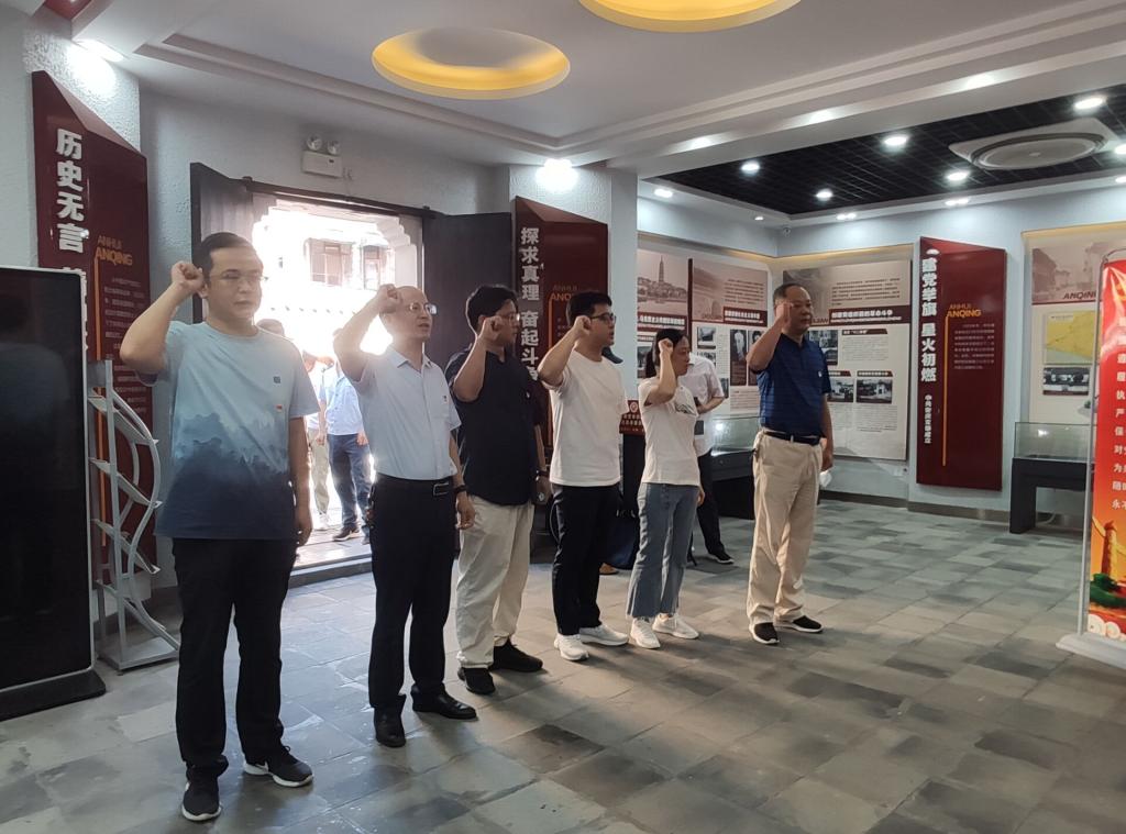 在中共安庆建党会议旧址陈列馆,大家仔细聆听了讲解员介绍的一个个鲜活的故事,观看了馆内一幅幅翔实生动的图片,了解了革命前辈召开建党会议、正式成立我省第一个城市党组织——中共安庆党支部的过程,重温了昔日安庆人民那段为寻求救国救民的真理、探索民族独立、人民解放的道路奋起斗争的革命历程,身临其境地感受了安庆人民义无反顾投身革命的伟大情怀。在庄严、肃穆的纪念馆中,全体党员面对鲜红的党旗重温了入党誓词。