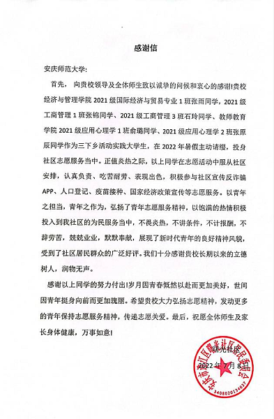 近日,经济与管理学院收到一封来自安庆市迎江区曙光社区居民委员会的感谢信。信中对该院2021级国际经济与贸易专业张雨同学、2021级工商管理类专业张锦同学、石玲同学积极参加暑期三下乡实践调研活动,主动参与社区志愿服务的优秀事迹表示感谢,对纽约国际官网培养出“认真负责,吃苦耐劳,兢兢业业,默默奉献”的优秀大学生表示称赞。