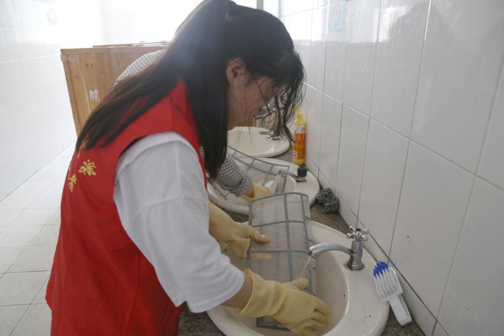 拆卸、清洗、安装,学生工作人员们分组前往学校14栋宿舍楼的寝室进行清洗,每天约完成120余个宿舍的空调过滤网清洗工作。