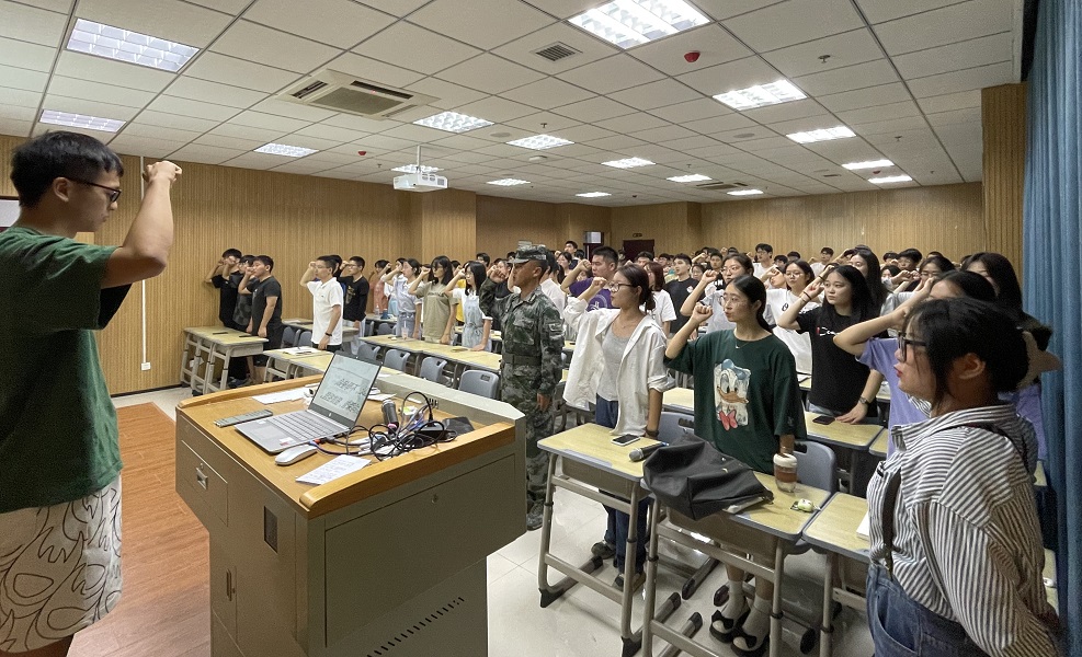 团日活动共分为三部分,第一部分是“勿忘九一八,振奋爱国志”。歌曲《松花江上》唱出了东北同胞们的心声,悲怆的旋律让大家深深感受到祖国土地沦丧时的心酸与无奈。在观看了《勿忘国耻“九一八”事变》视频后,20级金融工程(2)班王鑫宇表示:“我感触颇深,深知当今幸福来之不易,我们青年更应顶天立地,勿忘国耻,奋发图强,从而报效祖国”。第二部分是“山河已无恙,吾辈当自强”。2022年9月复员到2019级财务管理(2)班大学生退伍士兵陆晨晖围绕《你印象里的人民军队是什么样的?》主题,向同学们分享了自己的军营生活,还讲解参军政策,鼓励毕业生同学积极参军报国。第三部分是“缅怀过去,展望未来”。在学生代表20级金融工程(1)班曹辉的带领下,全体成员起立,举起右手进行宣誓。“勿忘国耻,不辱使命。崇尚荣誉,报效祖国。为中华民族的伟大复兴而奋斗”,一声声嘹亮的宣誓声从教室传出。