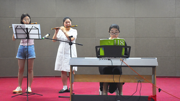 “一条大河波浪宽,风吹稻花香两岸……”伴着一首钢琴竹笛合奏表演《我的祖国》,现场不少观众都哼出了声。“今年是建党一百周年,希望通过这首曲子表达我对祖国的美好祝愿。”负责竹笛演奏的音乐学专业2019级(3)班吕庆虹认为,采用民族乐器与西洋乐器相结合的方式,是对演奏形式的一种创新,也更能激发大家观赏的兴趣。