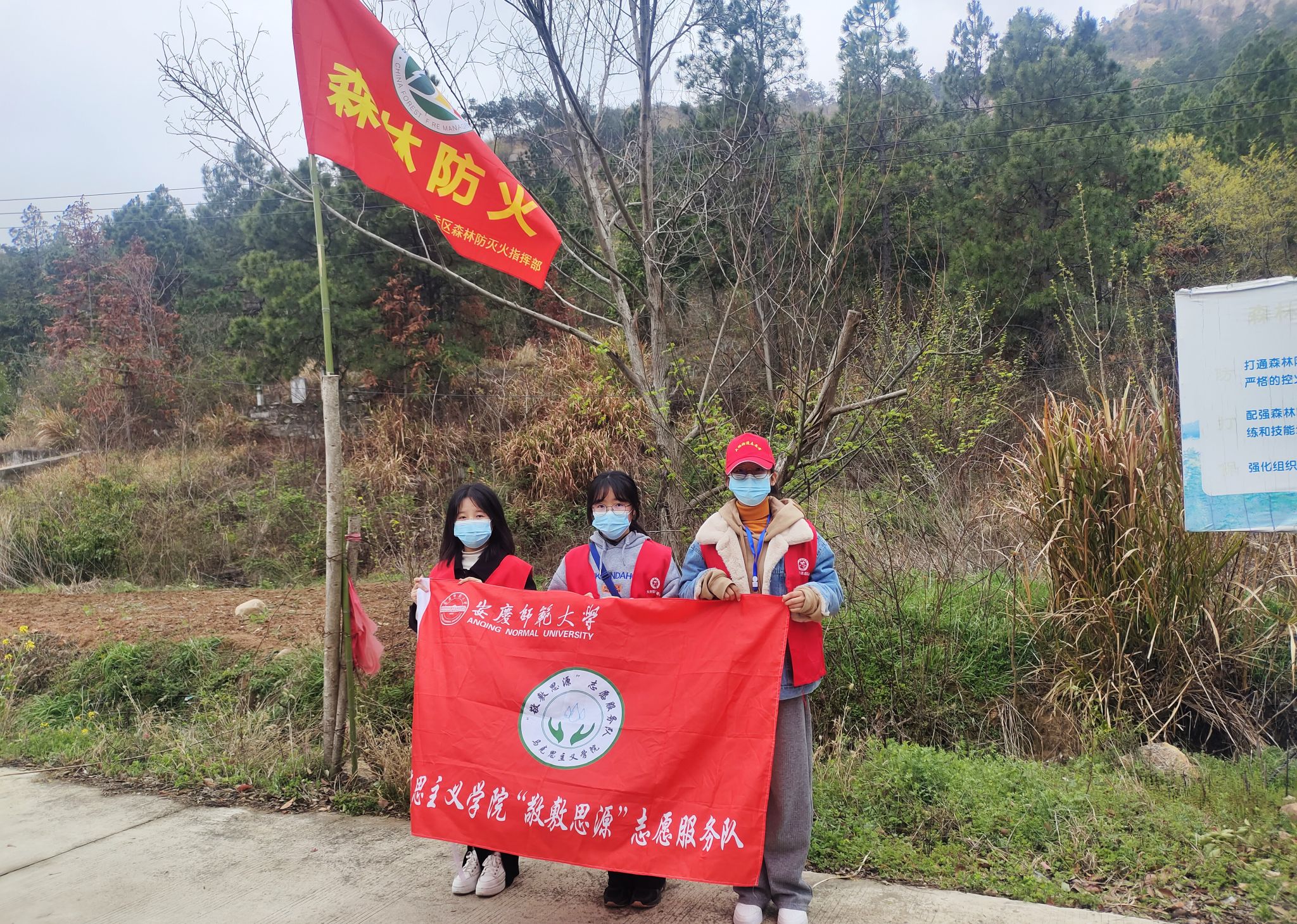 近日,马克思主义学院“敬敷思源”志愿服务队的8名学生前往宜秀区大桥街道眉山村开展“文明用火”劝导行动,并自发组成志愿小组,在各个防火点值班督察,为乡村森林防火工作贡献力量。