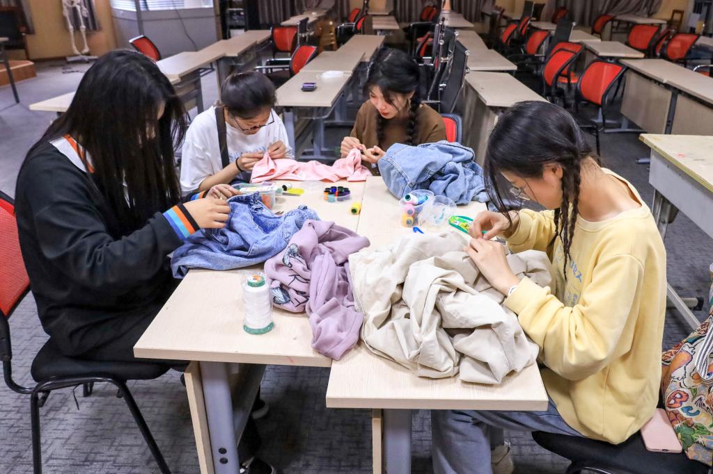 软尺、银针、剪刀、各色线团一一摆在桌上,“绣娘”专注地开始了手中的工作。作为学院望江挑花俱乐部的一名成员,设计学类专业2021级(2)班学生孙晨对针线的运用十分熟稔,她介绍自己从小就喜欢给洋娃娃缝衣服,针线活逐渐成为了自己的一门“手艺”,上大学后自己买了针线筒,为自己缝补衣服的同时解决室友的困难。