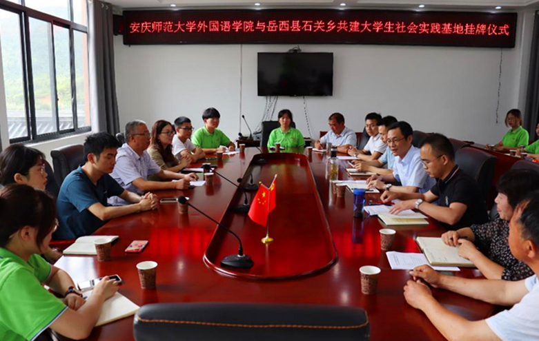7月5日,外国语学院与岳西县石关乡共建社会实践基地挂牌仪式在石关乡象形村村委会举行。外国语学院党委书记李亦亮,外国语学院党委副书记王惠等院党政领导,石关乡党委书记方球,共青团岳西县委书记储成焰,石关乡党委副书记胡熠,共青团岳西县委副书记张煜中,石关乡象形村党支部书记李永红及石关乡领导班子出席揭牌仪式,外国语学院“喜迎二十大,共筑石关梦”大学生暑期社会实践团全体成员参与。