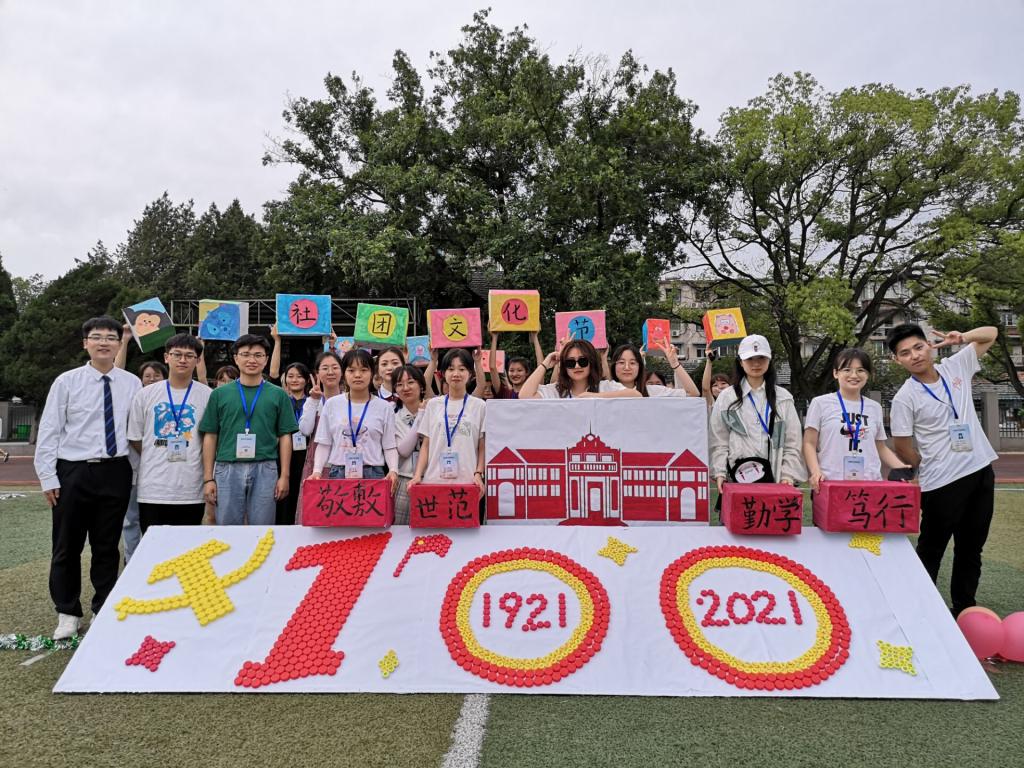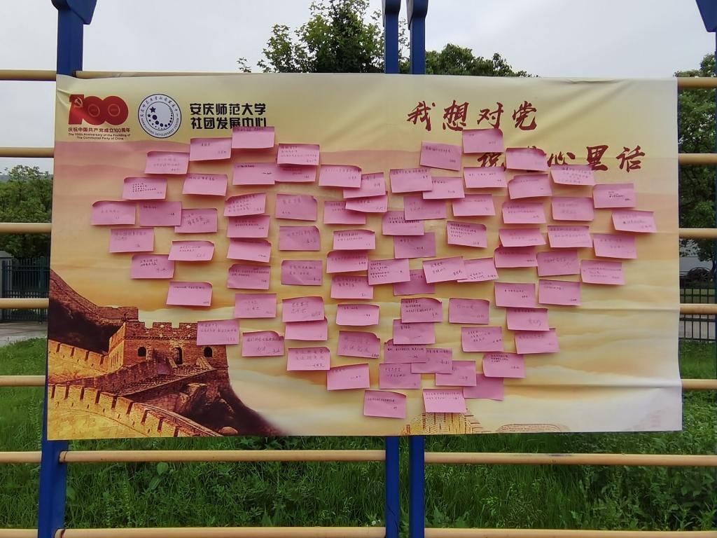 “我爱祖国我爱党”“祝党生日快乐”“祝党越来越好”……回收利用的瓶盖和纸箱,被拼成一副精致的建党百年主题图,海报板上也贴满了同学们想对党说的话。