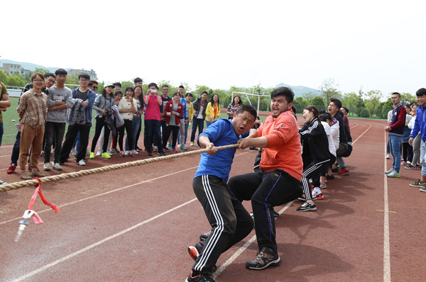 “哔——”的一声哨音,两队比赛选手的双手像一把把铁钳子似的,紧紧地握住麻绳,迈开弓箭步,作好了准备,绳子绷得如同一根铁棒。“加油,加油!”欢呼声此起彼伏。4月17日早上八点,校学生会举办趣味运动会,共有本校各学院学生会代表队组成的14支参赛队伍。比赛分滚雪球、贪吃蛇、拔河大赛三部分,最后累计三个部分总积分决出冠军、亚军、季军和优秀奖。