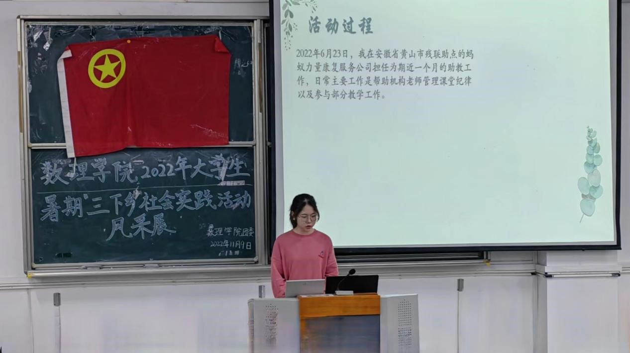 活动现场,学院暑期“三下乡”优秀实践团队分别从团队组建、实践活动策划、实践调研等方面展示了团队的实践经过与成果,让同学们感受到“三下乡”活动的独特魅力。优秀实践团队代表21级应用统计学专业吴荣姝同学通过PPT演示和视频相结合的方式,声情并茂地向同学们介绍了团队走访退伍老兵的经历,带领现场同学重温了老兵们抗战时期的那段珍贵又艰苦的岁月。数学与应用数学专业2022(1)班的韩雪同学在风采展结束后颇有感触地说:“听完学长学姐分享的愉快而有意义的暑期实践经历,我对暑期‘三下乡’活动有了更加清晰的了解,并且充满了期待。”