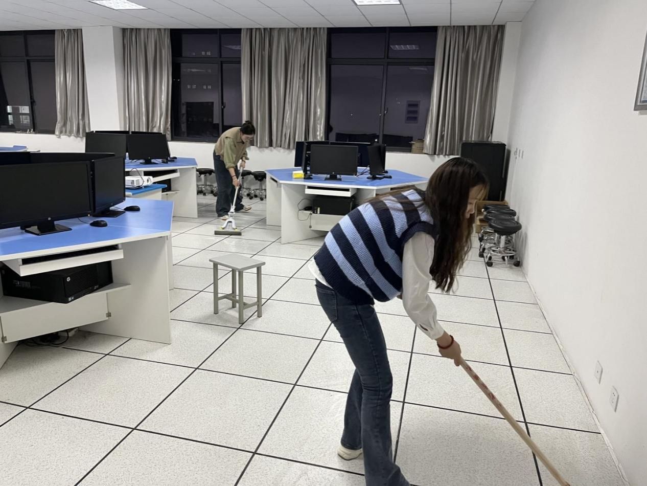 环境检测实验室、酒店管理实验室、土壤与水文实验室……作为一个应用型专业较多的学院,院楼里的实验室成为了学生们主要的清扫对象。在劳动实践开始前,实验室管理教师刘念向学生们简要说明了打扫的注意事项,如实验药品堆放整齐、易碎物品小心拿放、精密仪器不得触碰等。