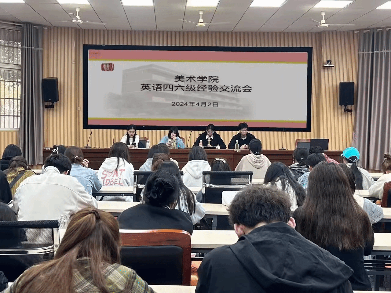 近日,美术学院在学术报告厅举办英语四六级考试经验交流会,会议邀请了4名已顺利通过国家英语四、六级考试的高年级同学分享经验,100余名低年级同学参加会议。