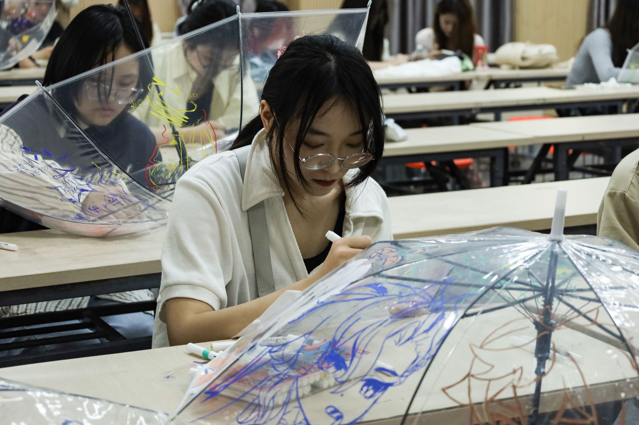 用丙烯颜料笔在伞面上勾画图案,铺色涂抹,撑伞风干,20余把结合了学生们“小巧思”的DIY透明雨伞便完成了。4月27日,美术学院在学院学术报告厅开展“绘伞引微凉,悠悠夏日长”活动,70余名学生在互动交流中挥洒创意。