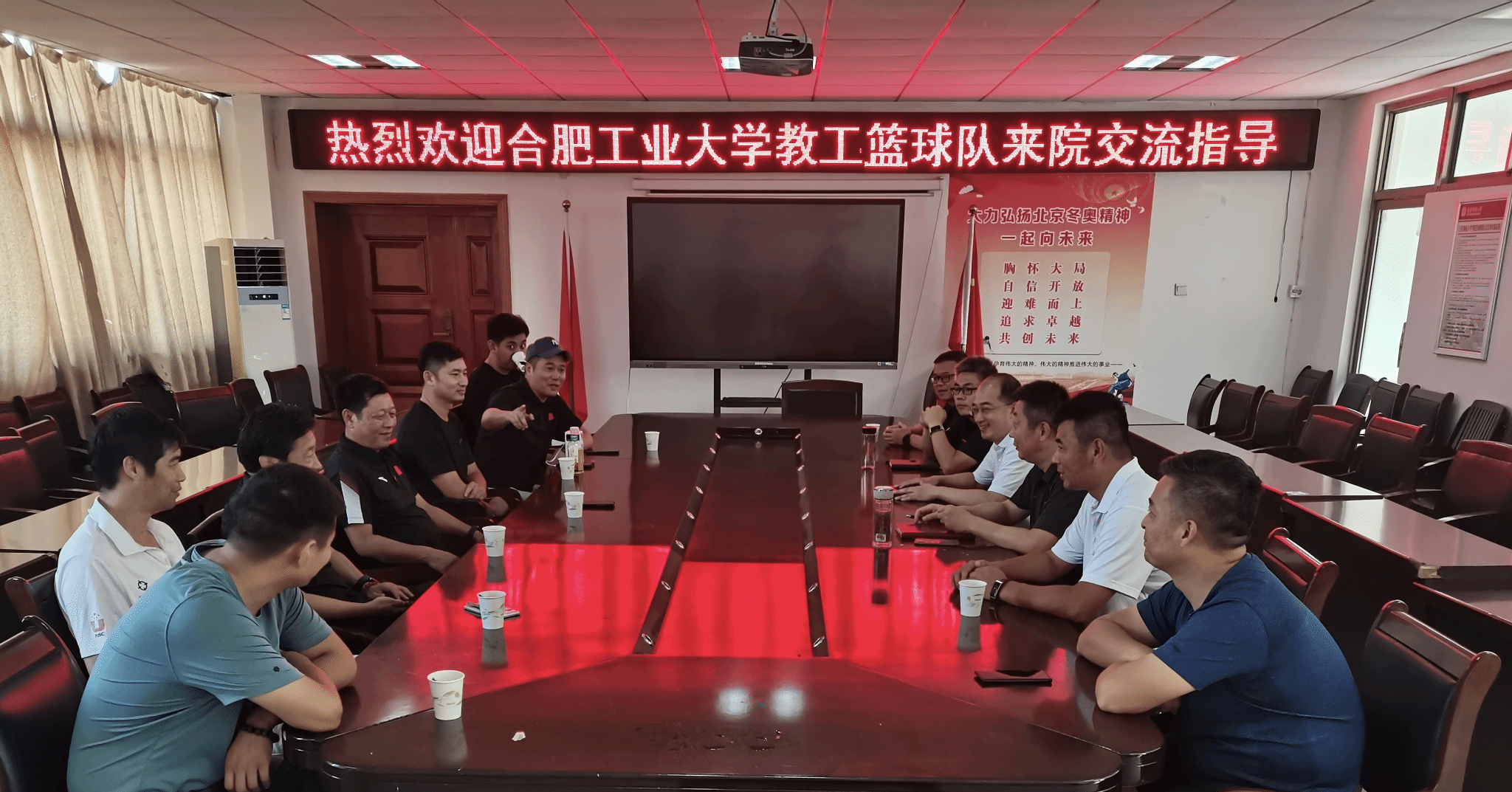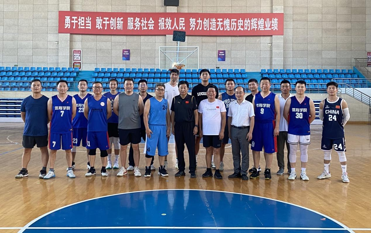9月5日,合肥工业大学体育部党总支委员袁同春、蒋治华带领教工篮球队来体育学院座谈交流。学院党委副书记、纪委书记王玮,副院长王晓东出席座谈会,并现场观看了篮球交流比赛。