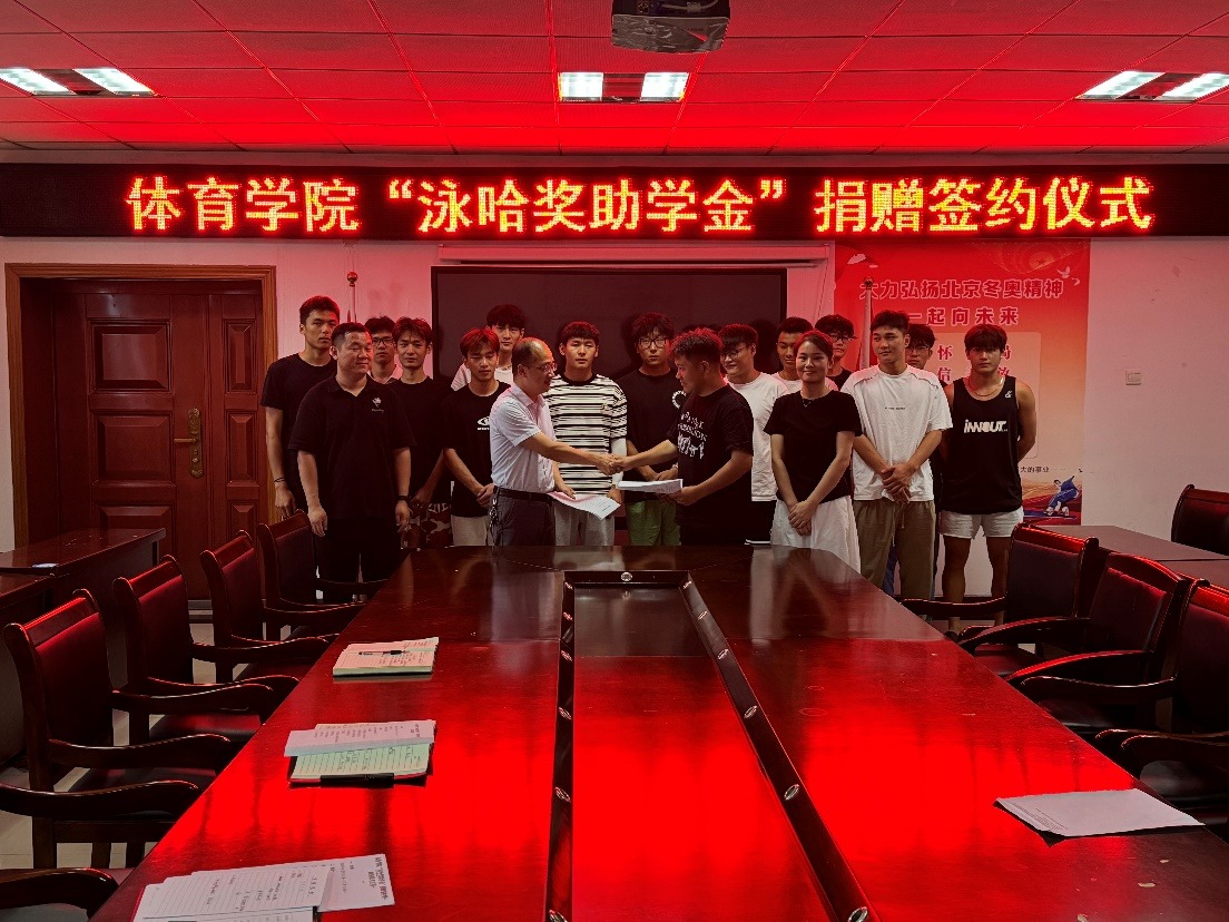 本次“泳哈奖助学金”捐赠金额为10万元,主要用于奖励、资助在专业实践等方面卓有成绩的在校学生,同时支持体育学院专业建设等事宜。体育学院将继续发挥学院优势特色,整合资源,多方努力,进一步做好资助育人工作,帮助体育学院学子成长成才,擦亮学院创新创业工作品牌,提升人才培养质量和水平。(撰稿、摄影:刘欣       编辑:王玉        编辑:江伟        审核:王玮 赵丽丽)