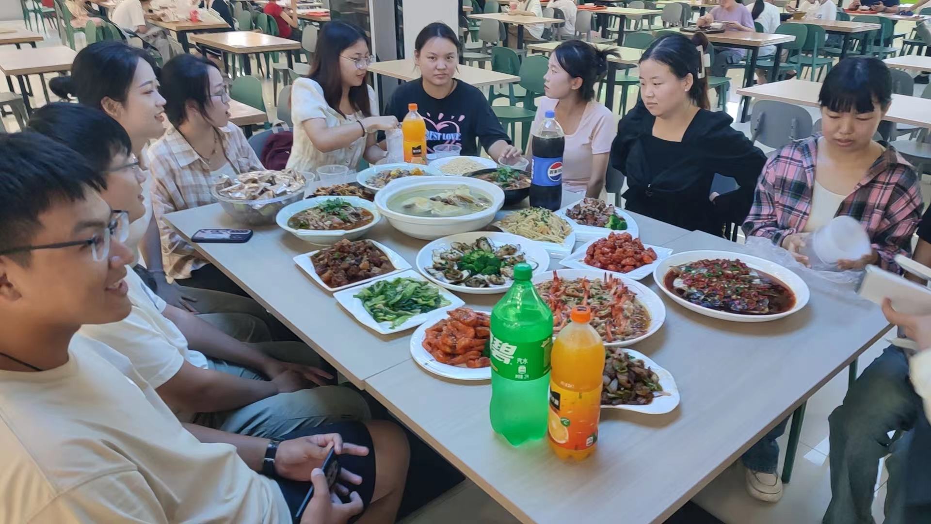 酸菜肥牛、蒜蓉粉丝虾、清蒸鲈鱼……西苑食堂经理代振辉为10名外省学生准备了一桌色香味俱全的中秋团圆饭,让在外求学的学生们也体会到了“家”的味道。来自内蒙古自治区、物流管理专业2021(1)班的石佳霖因为离家较远,所以很想念妈妈做的饭菜,而令她没想到的是学校的玉米排骨汤竟缓解了她的“思乡之情”。“这道菜和我妈妈做的味道很像,非常感谢食堂经理的邀请,让中秋节没有回家团圆的我倍感温暖。”