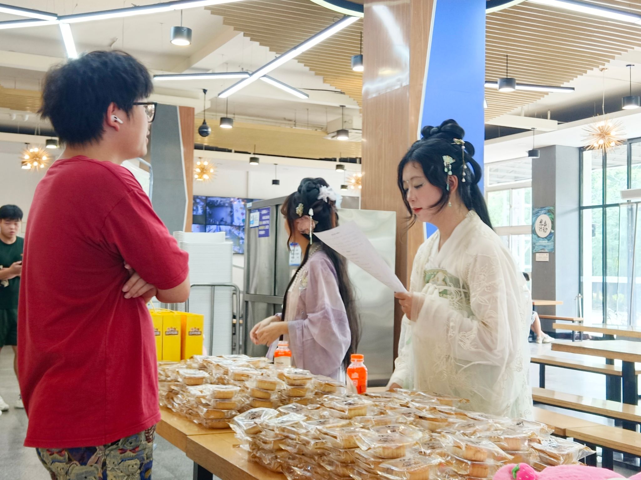 “海上生明月,天涯共此时。”,“明月到今宵,长是不如人约。”……校园版“诗词大会”在学校东苑第二食堂和西苑第一食堂拉开帷幕。“学生们可通过背诵与“月”相关的经典诗词来赢取特色的月饼奖励,且所背诵诗词的数量越多,获得的奖品将愈加丰厚。”东苑第二食堂经理倪升涛介绍着“游戏规则”。商务英语专业2023(3)班的杨月“轻松拿捏”5首诗,成功领取“通关奖励”鲨鱼玩偶。作为背诵诗歌最多的“参赛选手”,杨月表示,通过背诵诗歌庆祝中秋节,她不仅收获了节日礼物,还体会到了中华传统文化的独特魅力。