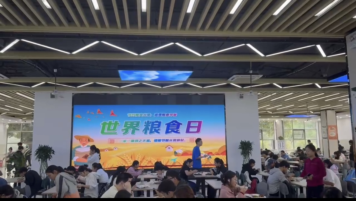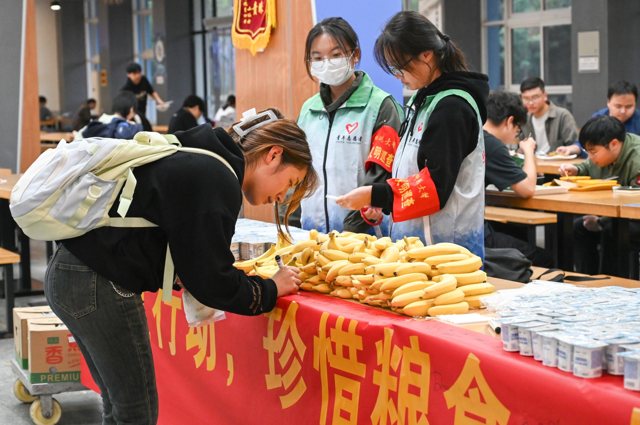 “光盘行动,珍惜粮食,从我做起!”在东苑第二食堂开展光盘有奖活动,桌子上摆满了香蕉和酸奶,它们正向路过的师生“招手”。学校各食堂的大屏上也放映着“世界粮食日”的字样。