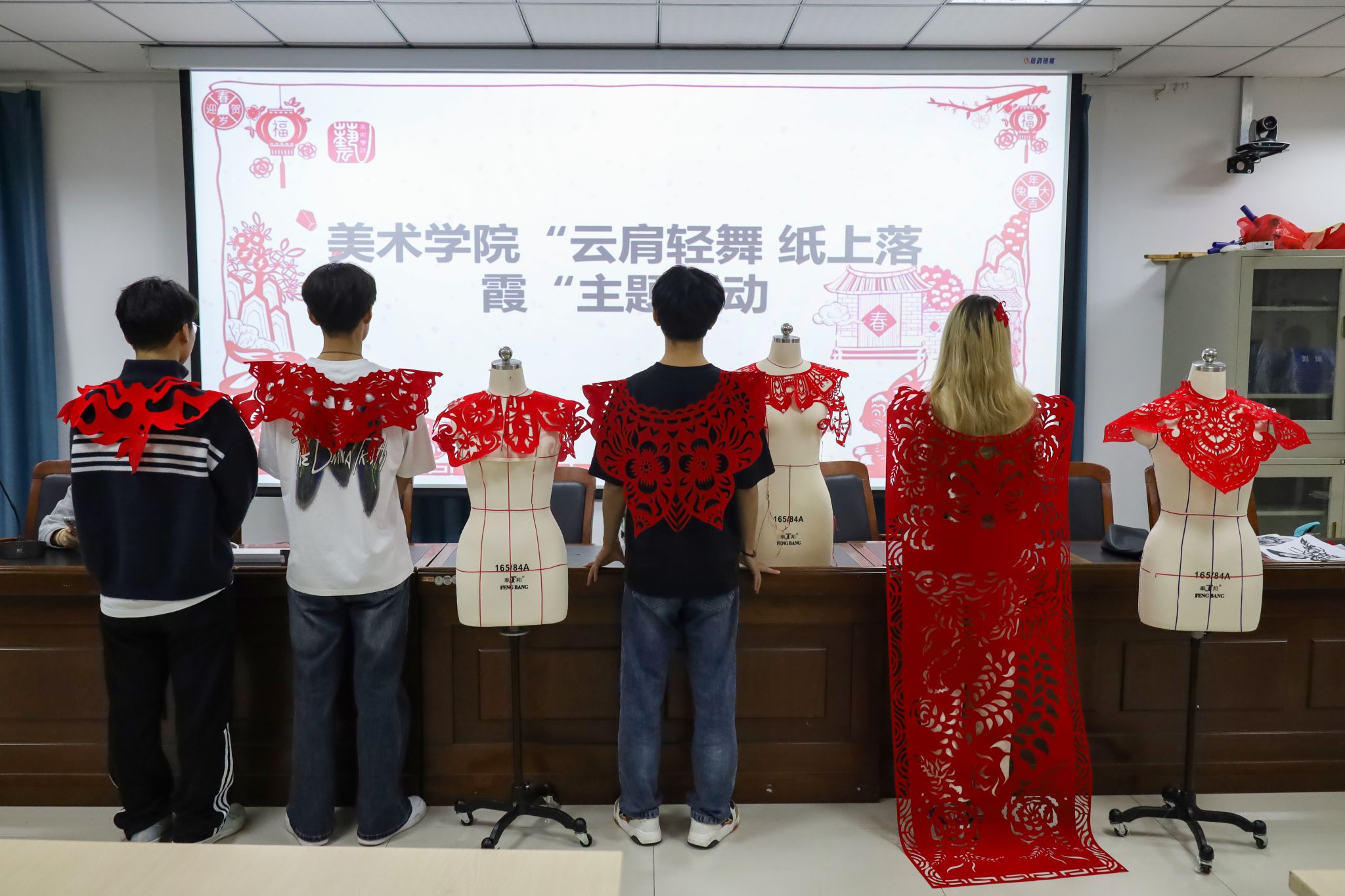 对开云肩、四方云肩、有领云肩等近10幅剪纸云肩制作完成后,在服装模特以及学生身上展示。设计学类专业2024(2)班的王婧怡穿戴由王启凤制作的大型剪纸披肩,吸引了不少制作完成的学生合影“打卡”。她表示自己在佩戴上云肩后,感受到了文化自信的力量。她直言:“通过剪纸,最美的云彩,在此刻被留在了肩上。”