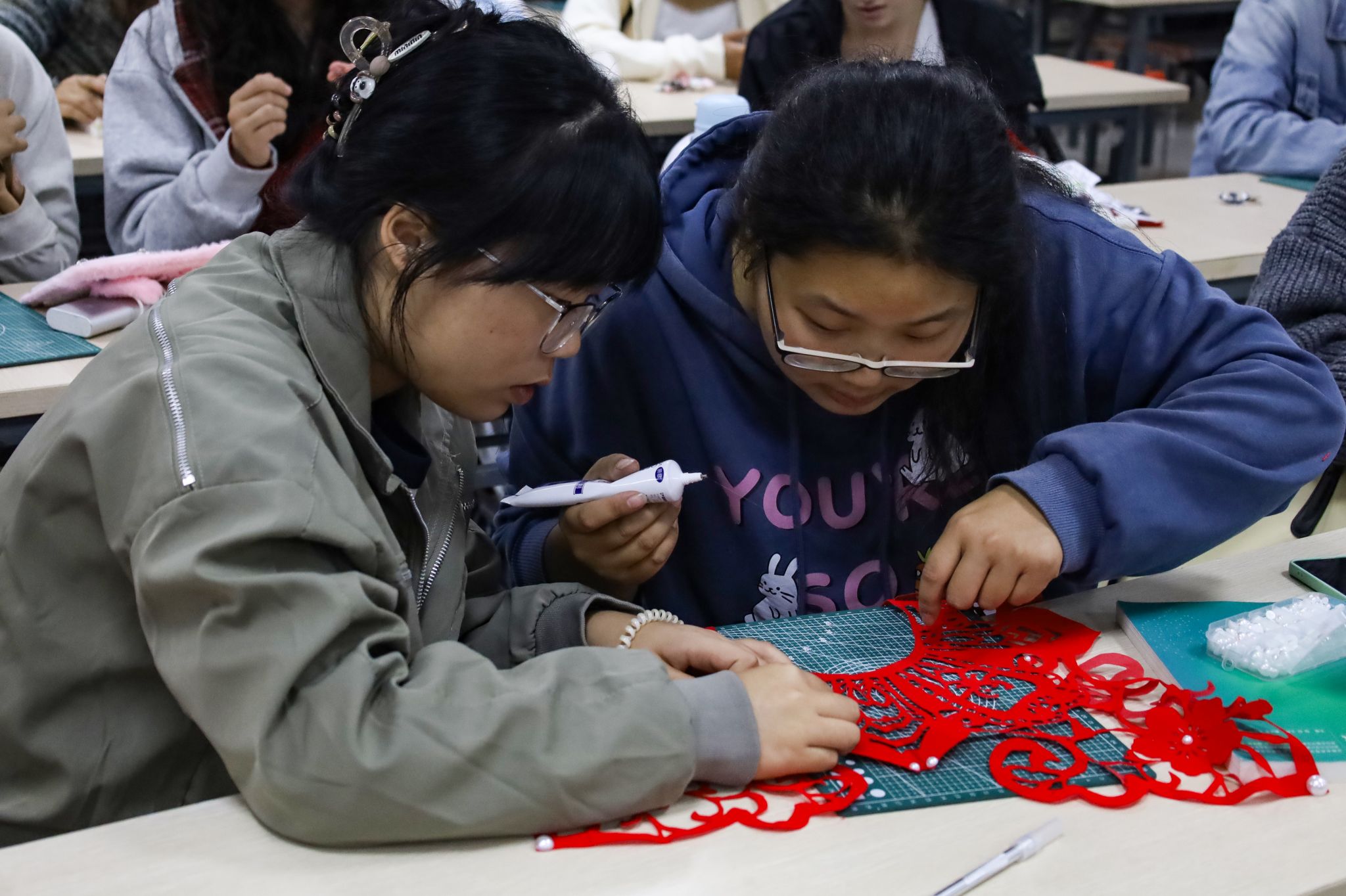 你是否想象过能够穿在身上的剪纸?在美术学院剪纸俱乐部的成员手中,剪纸化身中华传统装饰织物——云肩,白底红花的图案中展现浓厚的中国美学。11月14日,美术学院在P楼212教室举办“云肩轻舞,纸上落霞”主题活动,60余名学子汇聚一堂,以刻刀为笔,红纸为媒,共同探索剪纸与云肩这两种非物质文化遗产的融合之美。